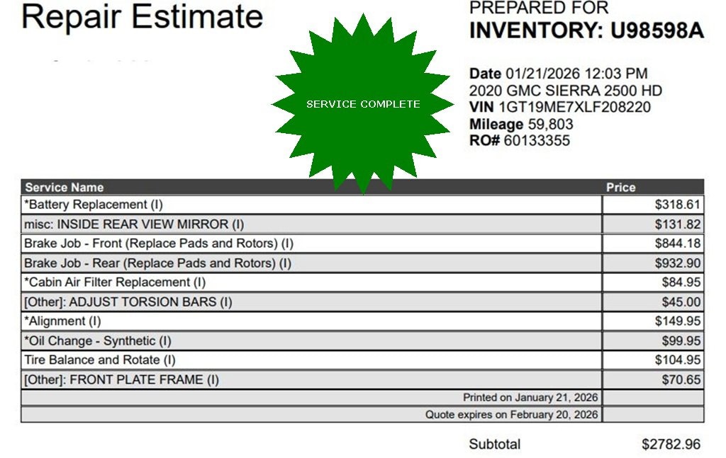Royal Motor Company is proud to offer this good-looking 2020 GMC Sierra 2500HD a truly great-looking Truck with the following Features: Suspension Package, 17 Machined Aluminum Wheels, 2-Speed Electronic Shift Transfer Case, 3.73 Rear Axle Ratio, 4-Way Manual Driver Seat Adjuster, 4-Way Manual Passenger Seat Adjuster, 4-Wheel Disc Brakes, 4G LTE Wi-Fi Hotspot Capable, 6 Speakers, 6-Speaker Audio System Feature, ABS brakes, Air Conditioning, Alloy wheels, AM/FM radio, Apple CarPlay/Android Auto, Brake assist, Bumpers: chrome, Chrome Surround Grille w/High Gloss Black Mesh, Cloth Seat Trim, Compass, Compass Located In Instrument Cluster, Deep-Tinted Glass, Delay-off headlights, Driver door bin, Driver vanity mirror, Dual front impact airbags, Dual front side impact airbags, Electronic Stability Control, Exterior Parking Camera Rear, Front 40/20/40 Split-Bench Seats, Front anti-roll bar, Front Center Armrest w/Storage, Front reading lights, Front wheel independent suspension, Fully automatic headlights, GMC Connected Access Capable, Heated door mirrors, Heavy-Duty 80 Amp Battery, Illuminated entry, Integrated Trailer Brake Controller, Low tire pressure warning, Manual Tilt Wheel Steering Column, Occupant sensing airbag, OnStar & GMC Connected Services Capable, Outside temperature display, Overhead airbag, Overhead console, Panic alarm, Passenger door bin, Passenger vanity mirror, Pickup Box, Power Door Locks, Power door mirrors, Power Rear Windows w/Express Down, Power steering, Power windows, Power Windows w/Driver Express Up/Down, Premium audio system: GMC Infotainment System, Radio: AM/FM w/GMC Infotainment System, Rear reading lights, Rear step bumper, Remote Keyless Entry, Remote keyless entry, Speed control, Split folding rear seat, Steering Wheel Audio Controls, Steering wheel mounted audio controls, Tachometer, Tilt steering wheel, Traction control, Trip computer, Turn signal indicator mirrors, Variably intermittent wipers, and Voltmeter.