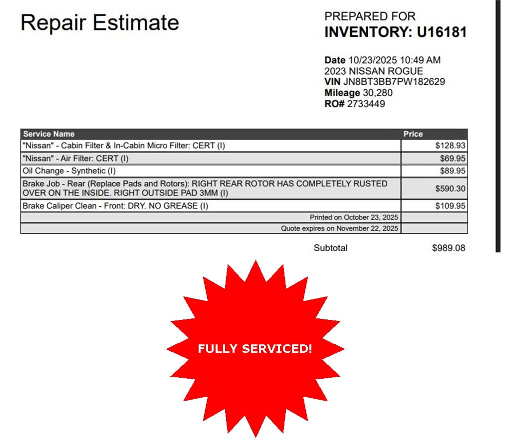 Royal Nissan Subaru is proud to offer this stunning-looking 2023 Nissan Rogue an absolutely wonderful-looking SUV with the following Features: 18" Aluminum Alloy Wheels, 4-Wheel Disc Brakes, 5.604 Axle Ratio, 6 Speakers, ABS brakes, Air Conditioning, Alloy wheels, AM/FM Radio, AM/FM radio: SiriusXM, Auto High-beam Headlights, Automatic temperature control, Black Splash Guards (Set of 4), Brake assist, Bumpers: body-color, Chrome Rear Bumper Protector, Cloth Seat Trim, Delay-off headlights, Driver door bin, Driver vanity mirror, Dual front impact airbags, Dual front side impact airbags, Electronic Stability Control, Emergency communication system: NissanConnect Services, Four wheel independent suspension, Front anti-roll bar, Front Bucket Seats, Front Center Armrest, Front dual zone A/C, Front reading lights, Fully automatic headlights, Heated door mirrors, Illuminated entry, Knee airbag, Low tire pressure warning, NissanConnect featuring Apple CarPlay and Android Auto, Occupant sensing airbag, Outside temperature display, Overhead airbag, Overhead console, Panic alarm, Passenger door bin, Passenger vanity mirror, Power door mirrors, Power driver seat, Power steering, Power windows, Radio data system, Rear anti-roll bar, Rear Parking Sensors, Rear seat center armrest, Rear side impact airbag, Rear window defroster, Rear window wiper, Remote keyless entry, Security system, Speed control, Speed-Sensitive Wipers, Split folding rear seat, Spoiler, Steering wheel mounted audio controls, Tachometer, Telescoping steering wheel, Tilt steering wheel, Traction control, Trip computer, Turn signal indicator mirrors, and Variably intermittent wipers.