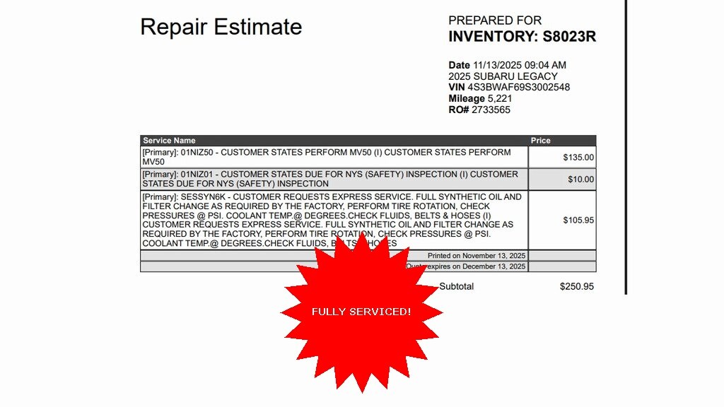 Royal Nissan Subaru is proud to offer this good-looking 2025 Subaru Legacy an absolutely wonderful-looking Sedan with the following Features: BSD w/RCTA & Keyless & Fog Lts & Moonroof & Nav (Blind Spot Detection w/Rear Cross-Traffic Alert, Keyless Access w/Push Button Start, LED Fog Lights, Power Moonroof, and Radio: Subaru 11.6" Multimedia System w/Navigation), Popular Package #1 (Auto-Dimming Mirror w/Compass & HomeLink, Cargo Tray, Exterior Auto-Dimming Mirror w/Approach Light, LED Upgrade, and Rear Bumper Applique), 4-Wheel Disc Brakes, 6 Speakers, ABS brakes, Air Conditioning, All-Weather Floor Liners, Alloy wheels, AM/FM radio: SiriusXM with 360L, Anti-whiplash front head restraints, Apple CarPlay & Android Auto, Auto High-beam Headlights, Automatic temperature control, Brake assist, Bumpers: body-color, Cargo Net, Cloth Upholstery, Driver door bin, Driver vanity mirror, Dual front impact airbags, Dual front side impact airbags, Electronic Stability Control, Emergency communication system: MySubaru Safety Plus (3-year free trial included), Exterior Parking Camera Rear, Four wheel independent suspension, Front anti-roll bar, Front Bucket Seats, Front Center Armrest w/Storage, Front dual zone A/C, Front reading lights, Fully automatic headlights, Heated door mirrors, Heated Front Bucket Seats, Heated front seats, Illuminated entry, Knee airbag, Leather steering wheel, Low tire pressure warning, Occupant sensing airbag, Outside temperature display, Overhead airbag, Overhead console, Panic alarm, Passenger door bin, Passenger vanity mirror, Power door mirrors, Power driver seat, Power steering, Power windows, Radio: Subaru 11.6" Multimedia Plus System, Rear anti-roll bar, Rear seat center armrest, Rear Seatback Protector, Rear window defroster, Remote keyless entry, Security system, Speed control, Speed-sensing steering, Splash Guards, Split folding rear seat, Steering wheel mounted audio controls, Tachometer, Telescoping steering wheel, Tilt steering wheel, Traction control, Trip computer, Turn signal indicator mirrors, Variably intermittent wipers, Wheels: 17" x 7.5J Blk Mach Finish Aluminum-Alloy, and Wireless Charger.
